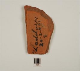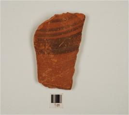 | Description / विवरण | A fragment of pot of red ware, painted with horizontal lines and thick band in black on the exterior of medium fabric, showing an oxidized core and treated with red slip. |