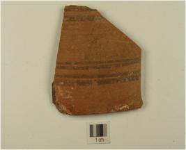 | Description / विवरण | Fragment of dull red ware, treated with red slip on the exterior and painted with multiple horizontal lines in black pigment on the outer surface. |