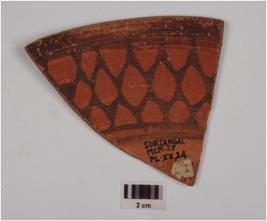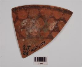 | Description / विवरण | Fragment of a dish of red ware having a featureless rim and painted in black horizontal bands and hollow star pattern on the surface, of medium fabric showing an oxidized core and treated with red slip. |