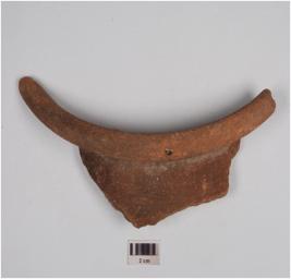| Description / विवरण | A fragment of rim, a vase of dull-red ware, obliquely splayed out rim, concavity below, spreading shoulder and of medium fabric. |