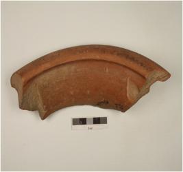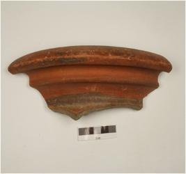| Description / विवरण | A fragment of rim, jar of red ware, horizontally splayed out rim, bold ridge on neck, treated with red slip and horizontal band in black pigment on profile, medium fabric. |