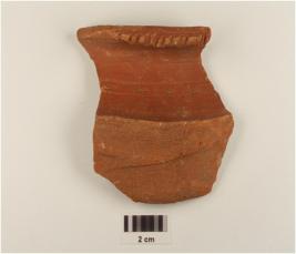 | Description / विवरण | A fragment of rim, miniature handi, obliquely splayed out rim, concave neck, carination on profile, rustication below, nickle pattern on edges of rim, groove dots in neck, treated with red slip and medium fabric. |