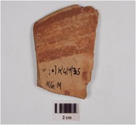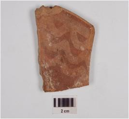 | Description / विवरण | Fragment of rim, a bowl of buff and red ware, treated with red slip, has featureless rim, tapering profile, and painted with wavy lines in chocolate pigment. |