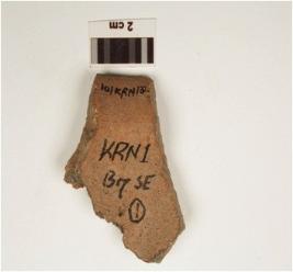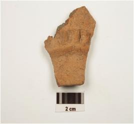 | Description / विवरण | A fragment of vase of dull red ware has slightly out curved rim and concave neck with finger impression on outer surface of medium fabric and showing an oxidized core. |