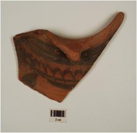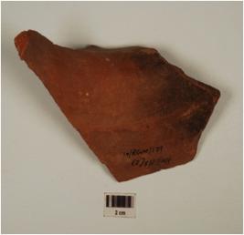 | Description / विवरण | A fragment of jar of redware, painted with thick band and loop design on the horizontal band, solid leaf in black on the exterior, of medium fabric, showing an oxidized core and treated with red slip. |