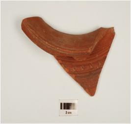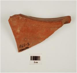 | Description / विवरण | Fragment of rim vase of red ware with obliquely splayed externally project constricted neck, grooved neck, grooved triangular design wihtin horizontal lines in black pigment on shoulder. |