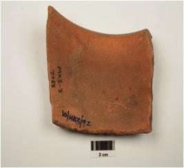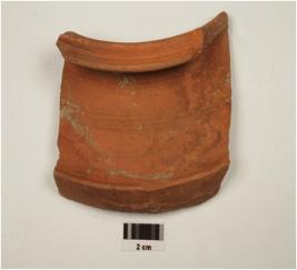 | Description / विवरण | A fragment of handi of red ware, obliquely spalyed out rim with a groove on the edge, concave neck, carrination on the shoulder, treated with red slip of medium fabric and showing an oxidized core. |