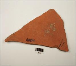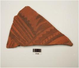 | Description / विवरण | A fragment of red ware having horizontal lines & leaf motif on the surface in black pigment, treated with red slip, of medium fabric and showing an oxidized core. |