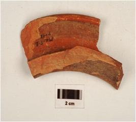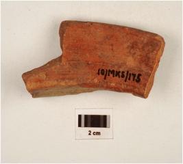 | Description / विवरण | Fragment of a vase of red ware with an out curved rim and short concave neck of medium fabric showing an oxidize core and treated with red slip. |