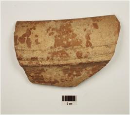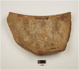 | Description / विवरण | A fragment of basin dull red ware has incurved rim medium fabric showing an oxidized core. |