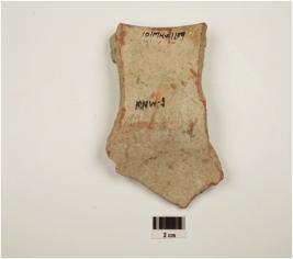 | Description / विवरण | A fragment of jar of dull red ware has externally thickened rim with vertical neck and flaring shoulder of medium fabric showing an oxidized core. |