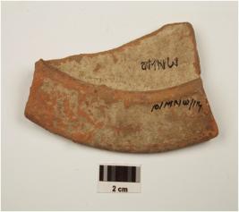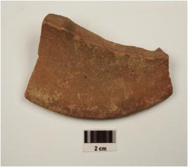 | Description / विवरण | A fragment of jar of dull red ware has collared rim with verical neck of medium fabric and showing an oxidized core. |