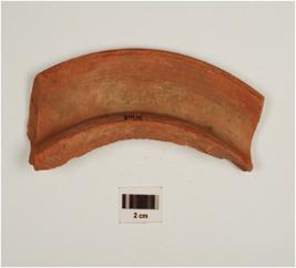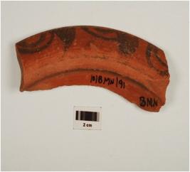| Description / विवरण | Fragment of rim a bowl of red ware, with horizontally splayed out rim, painted with leaf and semi circles , of medium fabric and showing an oxidized core. |