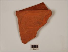 | Description / विवरण | Fragment of a red ware, red slipped partly on the exterior, convex profile with a ridge and carination below having rustication on the outer surface. |