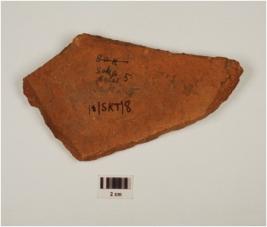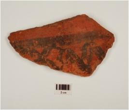| Description / विवरण | Potsherd of red ware, painted horizontal and wavy bands, of medium fabric, showing an oxidized core and treated with red slip. |