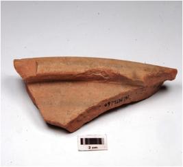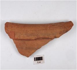 | Description / विवरण | A fragment of storage jar of red ware treated with red slip on the exterior has elliptically collared rim , concave neck, and painted with horizontal band on rim and below in black pigment. |