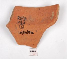 | Description / विवरण | A fragment of vase of red ware with externally thickened rim, receding profile, of medium fabric and showing an oxidized core and treated with red slip. |