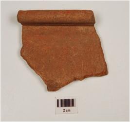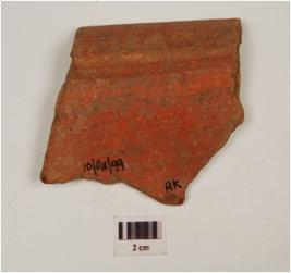 | Description / विवरण | Fragment of rim a basin of red ware treated with red slip, has horizontally splayed out rim and concave profile. |