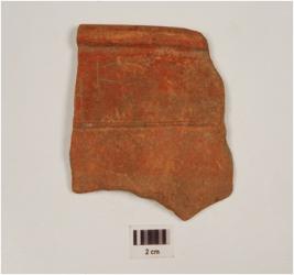 | Description / विवरण | Fragment of rim a vase of red ware treated with red slip, has clubbed rim and convex profile with groove on the exterior. |