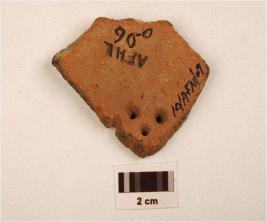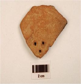 | Description / विवरण | A pot sherd of red ware, four perforation on the exterior, of coarse fabric and showing an oxidized core and treated with red slip. |