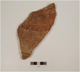 | Description / विवरण | Fragment of a red ware treated with red slip on the outer surface incised with oblique band in applique, oblique strokes, horizontal line and a ridge below. |