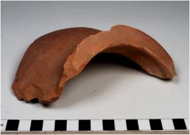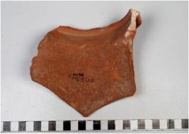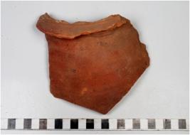 | Description / विवरण | A fragment of a vase of red ware with flanged rim, gobular profile, concave neck and oblique sides of medium fabric. |