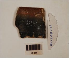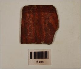 | Description / विवरण | Fragment of a bowl of russet coated painted ware having a featureless rim and painted in white vertical lines on the exterior, of medium fabric and showing an oxidized core. |