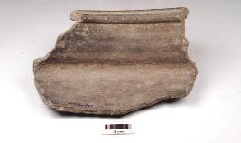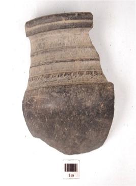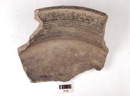 | Description / विवरण | Fragment of a handi of grey ware with out curved rim with projection and grooved, projected horizontal lines, notched incised design on neck, convex shoulder, medium fabric and black slip on interior. |