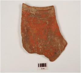 | Description / विवरण | A potsherd of red ware has incised horizontal lines on the exterior surface of coarse fabric, showing an oxidized core, and treated with red slip. |