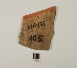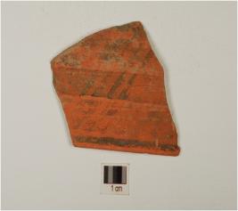 | Description / विवरण | Fragment of a bowl of red ware with featureless rim, having a incisions on profile, painted with horizontal and oblique lines of fine fabric and showing an incomplete oxidized core. |