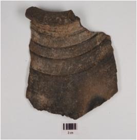 | Description / विवरण | Fragmentary vase of grey ware with an out curved rim and spreading profile having wide grooves around the shoulder, of medium fabric showing an oxidized core and treated with black slip. |