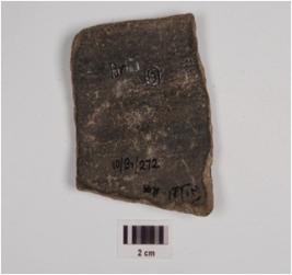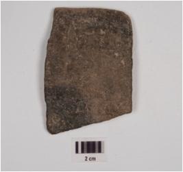 | Description / विवरण | Fragmentary bowl of grey ware with a featureless rim, convex body, of medium fabric showing an oxidized core and treated with black slip externally. |