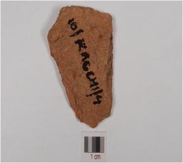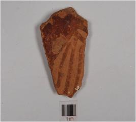 | Description / विवरण | Potsherd of dull red ware, exterior surface treated with orange slip, painted with oblique lines and horizontal thick band below in red pigment and of medium fabric. |