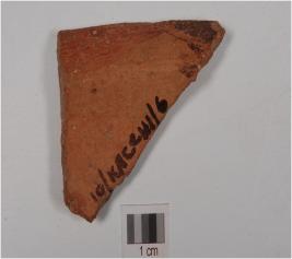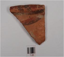 | Description / विवरण | Fragment of vase of red ware, has obliquely splayed rim, painted with slanting strokes on rim and curvy lines on exterior in black and red pigment and of medium fabric. |