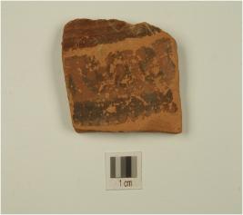 | Description / विवरण | Potsherd of red ware , having faded multiple horizontal lines, circles and a band with strokes in black pigment on the exterior, of medium fabric and showing an oxidized core,. |