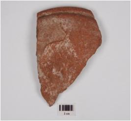 | Description / विवरण | Fragment of dish of red ware, in-curved thickened rim, convex profile, flat base, smoky section, treated with red slip and of medium fabric. |