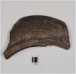 | Description / विवरण | Fragment of a vase of black ware, treated with black slip on both sides, has oblique splayed out rim and concave neck. |