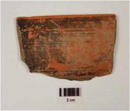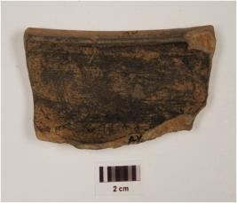 | Description / विवरण | Fragment of rim bowl of red ware, treated with black slip on both sides, has incurved flat top rim and convex profile. |