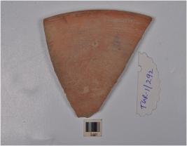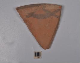 | Description / विवरण | A fragment of a bowl of red ware with featureless rim and painted with black wavy lines within horizontal lines on surface. |