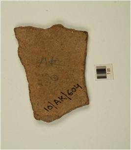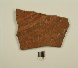 | Description / विवरण | Fragment of red ware, treated with red slip on the exterior and has grooves, incised strokes and punched triangles below. |