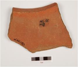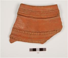 | Description / विवरण | Fragment of Rim a vase of red ware, treated with red slip on the exterior, has closing externally thickened grooved rim, and vertical notches on ridges with grooves on spreading shoulder. |