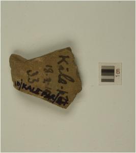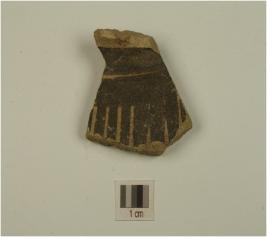 | Description / विवरण | Potsherd of buff ware, having horizontal bands and vertical lines in black pigment on the exterior, of medium fabric and showing an oxidized core. |