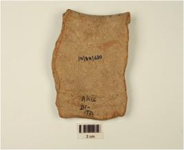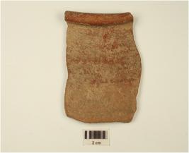 | Description / विवरण | Fragment of Rim jar of red ware, out curved beaded rim, of medium fabric, showing an oxidized core, and treated with red slip. |