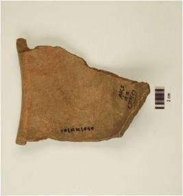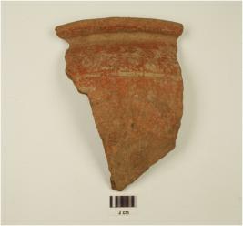 | Description / विवरण | Fragment of Rim vase of red ware, horizontally splayed out rim with globular profile, and incised lines on body of medium fabric, showing an oxidized core and treated with red slip. |