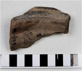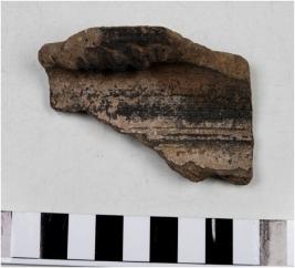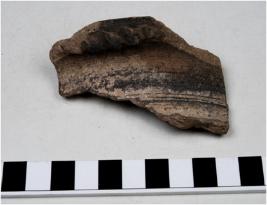 | Description / विवरण | A fragment of a vase of grey ware with flanged rim having applique design, concave neck straight sides and coarse fabric. |