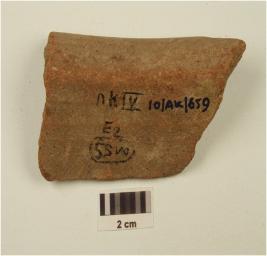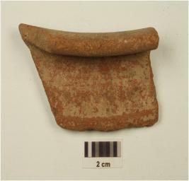| Description / विवरण | Fragment of Rim a vase of red ware, horizontally splayed out rim, concave neck of medium fabric, showing an oxidized core and treated with red slip. |