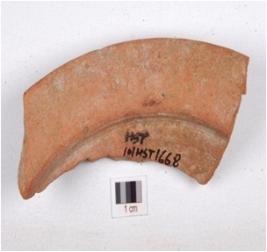 | Description / विवरण | Fragment of a vase of red ware, treated with red slip on both sides, has flaring rim with groove and concave neck. |