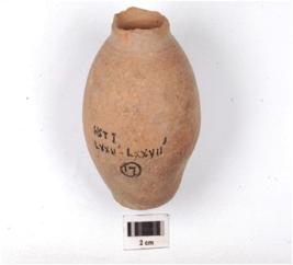 | Description / विवरण | A miniature vase of red ware, treated with red slip on the exterior has rim missing, concave neck, globular profile and disc base. |