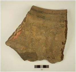 | Description / विवरण | A fragment of jar of red ware,obliquely splayed out rim,applique notched design on the profile,of medium fabric,showing an oxidized core and treated with red slip. |