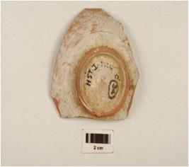 | Description / विवरण | Fragment of red ware potsherd incised design on surface showing an oxidized core and disc base. |